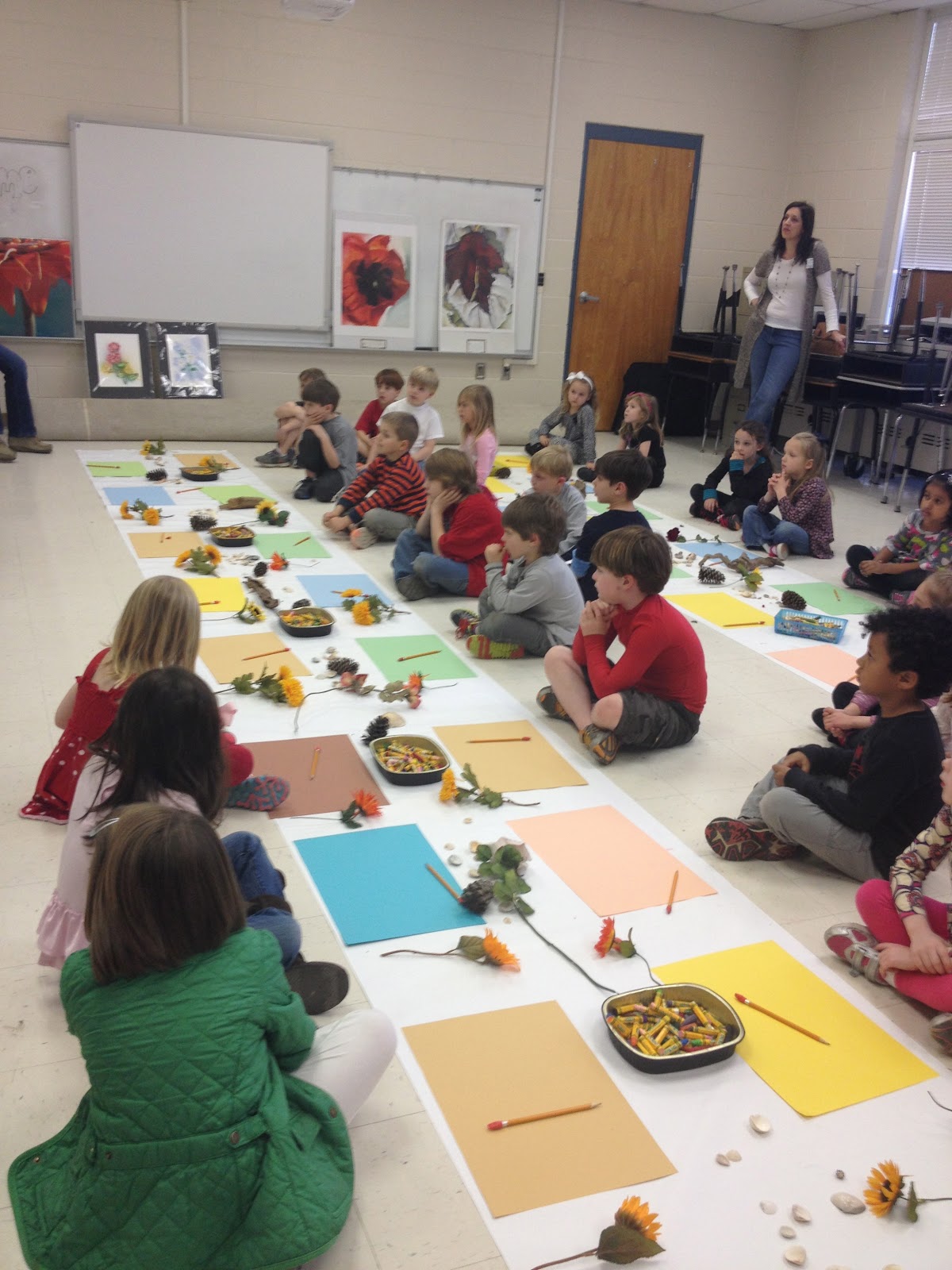 Thursday, the kindergarten children learned about the life of Georgia O'Keefe and Georgia's artistic style. After hearing about her, the children did a hand's on art project in the Geprgia O'Keefe style. Larry Gibson, art teacher at Pizitz Middle School, came to assist our children. He brought three of his advanced art students with him. The kindergarteners loved having the older girls help them.